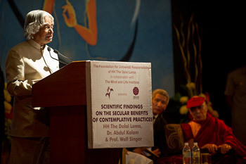 New Delhi, India, 20 November 2010 - Former President of India Dr. APJ Abdul Kalam spoke about the relationship between modern science and contemplative science in a dialogue with His Holiness the Dalai Lama and Prof. Wolf Singer, eminent neuroscientist and director of Max Planck Institute for Brain Research (Frankfurt) on the importance of scientific findings and the secular benefits of contemplative practices especially those that have originated and developed in India.