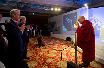 | His Holiness the Dalai Lama arrives at the Hindustan Times Leadership Summit in New Delhi on November 19th, 2010. Photo/Tenzin Choejor/OHHDL |