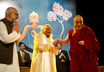 New Delhi, India, 20 November 2010 - His Holiness the Dalai Lama today engaged in a conversation with renowned Indian master Dr. Yogacharya BKS Iyengar on mind training and compassion in a discussion titled Yogic and Buddhist Techniques of Mind Training and Cultivating Compassion at the Convention Center of India Habitat Center in New Delhi.