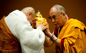 His Holiness the Dalai Lama receives a Buddha statue from a senior Korean monk in Yokohama, Japan on June 27th, 2010. Photo/Tenzin Choejor/OHHDL