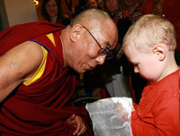 His Holiness the Dalai Lama greeted by a young well wisher outside his hotel in Maribor