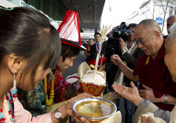 His Holiness is greeted on his arrival in Zurich in traditional Tibetan style. (Photo courtesy/Manuel Bauer)