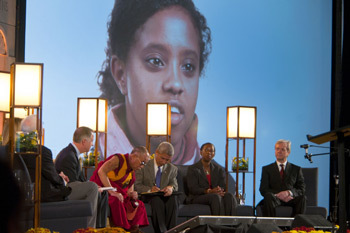 Atlanta, Georgia, USA 19 October 2010 - His Holiness the Dalai Lama spent the last full day of his current visit to Atlanta by participating in three different events that symbolized his commitments as also his hope that the current generation will make this century a peaceful one. In the morning he first addressed the participants of the International Tibetan Buddhist Conference in Emory University’s Conference Center before going to the Woodruff PE Center for an interactive session with students and faculty of Emory. In the afternoon, he participated in a conversation with artists about the role of the arts in promoting a compassionate society.
