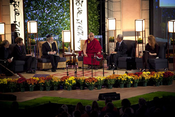 In the afternoon, His Holiness went back to the Woodruff PE Center to participate in a Summit on Happiness with The Most Reverend Dr. Katharine Jefferts Schori, the 26th Presiding Bishop of the Episcopal Church; Chief Rabbi Lord Jonathan Sacks of the United Hebrew Congregations of the Commonwealth (from the United Kingdom); and George Washington University Professor Seyyed Hossein Nasr, a world-renowned scholar on Islam. Journalist and radio host Krista Tippett, producer of the award-winning public radio program "Being" (formerly titled "Speaking of Faith"), served as the moderator.