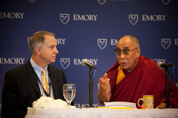 His Holiness the Dalai Lama and Emory University President James Wagner at a press conference on October 17th, 2010. Photo/Ann Borden/Emory