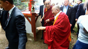 As His Holiness’s vehicle entered the ceremonial gate of the Center, children from the Tibetan community in Chicago performed the Tashi Sholpa dance. There were staff and supporters of the Center, including Tibetans, Mongolians, Japanese, Chinese, Americans and others, who stood beside the road, festooned with Tibetan and Buddhist flags, to welcome His Holiness. His Holiness blessed the newly constructed prayer wheel pavilion before proceeding to his residence. Among the lamas who received His Holiness at the entrance to his residence were the abbot of Gomang Monastery, Geshe Yonten Dhamchoe, the abbot of Tashi Lhunpo Monastery, Kachen Lobzang Tsetan, the abbot of Gandantegchinlen Monastery in Mongolia, Khamba Lama D. Choijamts (Choekyi Gyatso), Telo Rinpoche, head of the Kalmyk Buddhists of the Russian Federation, as well as the abbots of Erdene Zuu Monastery and the Kalachakra Temple also in Mongolia and the President of the Indiana Tibetan Association.