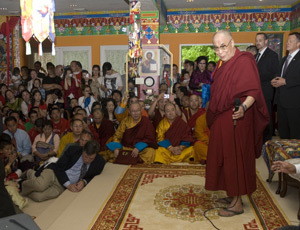 Bloomington, IN, USA, May 13th 2010 - This morning His Holiness first met with some scholars and students from China. Thereafter, he left for the teaching venue where he finished his explanation of the Heart Sutra. At the beginning of the program, the Heart Sutra was recited in Japanese, Korean and Mongolian. His Holiness commented that this was the first time he was hearing the Heart Sutra in Mongolian. He then recalled his first trip to Mongolia, which happened in 1979. His Holiness said that was a very touching trip.