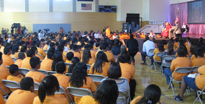 San Jose, California, USA, 13 October 2010 - On his second day of program in California, His Holiness spent the morning on October 13, 2010 at the San Jose State University Event Center to bestow the Amitabha Initiation at the request of the Geden Shoeling Center. In the afternoon, His Holiness drove to the nearby town of Palo Alto where he interacted with around 300 students under the Ravenswood school districts and thereafter provided comfort to ailing children housed by the Ronald McDonald House.