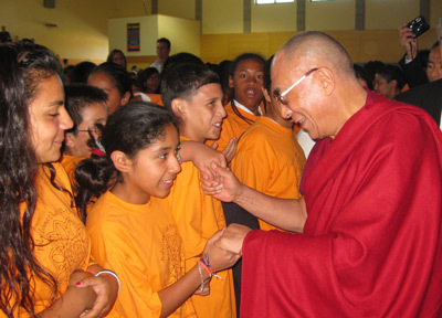 His Holiness the Dalai Lama shaking hands with students after his interactive session at Castano Middle School in East Palo Alto, California. Photo/OHHDL |