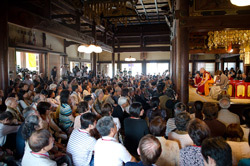Later His Holiness visited Saihoji Temple, where he consecrated the newly constructed eight foot statue of Buddha Amitabha, *Od padme*. The statue was initiated by the Chief Abbot Kaneko and built by Tibetan master artist Kalsang la and his team. At the consecration ceremony, His Holiness said, "we all have a Buddha seed in us, but Buddhahood is achieved through ones practice only. It is not something coming from Buddha and through praying only."