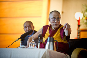 His Holiness the Dalai Lama gesturing to students during his talk at Setagaya Gakkuen School in Yokohama, Japan on June 25th, 2010. Photo/Tenzin Choejor/OHHDL