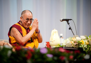 At Yokohama Grand Exhibition Hall, His Holiness taught on "Dependent Arising and Generation of Bodhisattvas' Heart" to the crowd of ten thousand people. Speaking on dependent arising philosophy (tenjung), He said that all phenomenon have no independent existence, things are there just because of some causes. "Therefore, the Buddhist philosophy of emptiness. Suffering is there because of ignorance, so the ignorance is cause of suffering. If we remove this ignorance, cause of suffering will cease." He said.