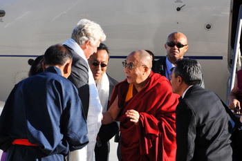 His Holiness left Miami University in Oxford, OH, on October 22, 2010 morning for Toronto. The president of the Canadian Tibetan Association of Ontario (CTAO), which is the host of his visit, Mr. Norbu Tsering, came to receive His Holiness i n Ohio. On his arrival at Toronto airport, His Holiness was welcomed by Toronto Mayor David Miller, Kasur Lobsang Nyima, and Board members of the CTAO while artists of the Tibetan Canadian Cultural Centre performed traditional dances and songs at the tarmac.