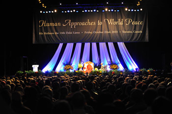 Toronto, Ontario, Canada, 22 October 2010 - His Holiness the Dalai Lama began his three-day visit to Toronto on October 22, 2010 by participating in a Symposium in the morning at the University of Toronto on “Cognitive Science, Mindfulness and Consciousness” and giving a public talk in the afternoon to 18,000 people “A Human Approaches to World Peace.”