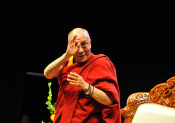 His Holiness the Dalai Lama waves to the audience at Rodgers Stadium in Toronto on October 22nd, 2010.