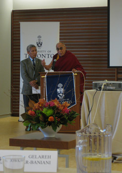 His Holiness the Dalai Lama speaking at the science symposium at the University of Toronto on October 22nd, 2010. Photo/OHHDL