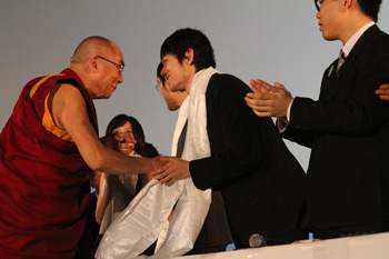 | His Holiness the Dalai Lama thanking the young people who shared the stage during the Peace Conference 2010 in Osaka on November 7th, 2010. Photo/Taikan Usui |
