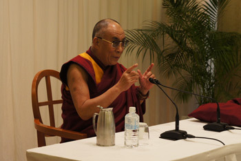 He began his group interview by outlining his main purposes in life, as a human being, a Buddhist and a Tibetan (and cited the example of India, where, "for more than 2000 years, all the major religious traditions have lived together. Of course there are some problems here and there. But mostly it's quiet harmonious"). He urged the media, in fact, not just to concentrate on bad news, which makes its audience think, "Basically, human people are bad. So humanity is doomed." Give them hope, he urged, give them courage!