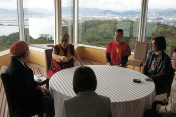 His Holiness the Dalai Lama meets with Japanese musicians in his hotel room in Hiroshima, Japan, on November 15th, 2010. Photo/OHHDL