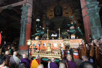 His Holiness the Dalai Lama joins monks from different groups to pray before the great Buddha at Todaji Temple in Nara, Japan, on November 8th, 2010. Photo/Taikan Usui