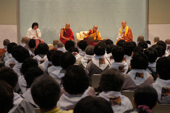 "Force," he explained, "is an unrealistic method. And any unrealistic method never brings a satisfactory result. That's quite clear, scientifically proven. Even if you want to hit someone, if you're angry, and you flail out, you may only hit your hand!" As the sun came in through the trees, His Holiness asked if the audience would mind his speaking a little longer and, in answer to their cheers, expanded on the importance of peace and took questions from every corner, concentrating especially on the schoolchildren. "Investigate," he emphasized, "study work, work hard" and almost everything is possible.