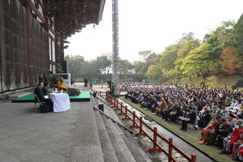 | His Holiness the Dalai Lama speaking to around 2,000 people at the Todaiji Temple in Nara, Japan, on Novembe 8th, 2010. Photo/Taikan Usui |