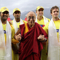 Dharamsala, HP, India, 18 April 2010 (By Gaurav Bisht, The Hindustan Times) - Spectators at the scenic stadium on Sunday had a rare glimpse of spirituality and sport coming together, with cricketers lining up to touch the feet of the Dalai Lama who presented "khatas' - Tibetan ceremonial scarves - to members of Kings XI Punjab and Chennai Super Kings.
