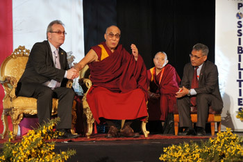 His Holiness the Dalai Lama and Richard Moore at the Possibilities civic summit in Dublin, Ireland on April 13th, 2011. Photo/Tenzin Taklha/OHHDL |