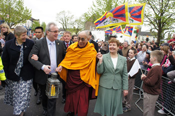 | His Holiness and Richard Moore, carrying the Brigid Flame, walking to St Brigid's Parish Church in Kildare, Ireland, on April 13th, 2011. Photo/Tenzin Taklha/OHHDL |