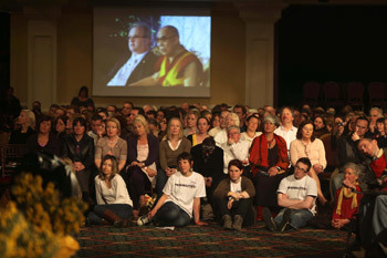 | Members of the 2,000 strong audience listening to His Holiness the Dalai Lama and Richard Moore at the "Possibilities" summit in Dublin, Ireland, on April 13th, 2011. Photo/Speirs |