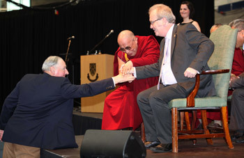 Richard Moore, Charles Inness and His Holiness the Dalai Lama clasp hands during the event at the University of Limerick on April 14th, 2011. Photo/Speirs |