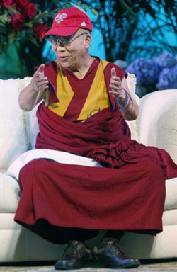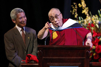 His Holiness the Dalai Lama answers a question from the audience after receiving an honorary degree at Southern Methodist University in Dallas, Texas, May 9, 2011. Photo/AP