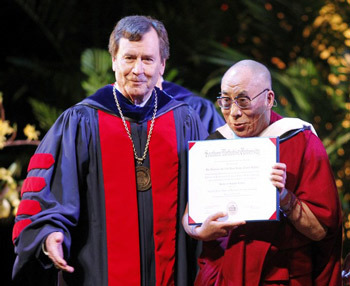 Thereafter President Turner and Provost Ludden conferred an honorary degree on His Holiness. In his remarks, Provost Ludden said, “Honorary degrees define the values of the university. We are charged with responsibilities of identifying individuals from all corners of the globe who, through a lifetime of sustained accomplishment and service, represent the highest values of this university. Today we honor His Holiness 14th Dalai Lama Tenzin Gyatso, spiritual leader of Tibet. More importantly he honors us. What we do in honoring this extraordinary individual is to define through him our institution and personal ideals that reflect discipline, creativity, tolerance, compassion and leadership.” He said the honorary degree was for His Holiness’ life long leadership in promoting peace, compassion and inter-religious understanding. The citation read, “Southern Methodist University, To all Whom these presents shall come, Greeting: Be it known that His Holiness the 14th Dalai Lama, Tenzin Gyatso, having honorably fulfilled all the requirements imposed by the authorities of this Institution, the President and the Trustees of Southern Methodist University, upon recommendation of the Faculty, do therefore confer the degree of Doctor of Humane Letters, honoris causa, with all the Honors, Rights, and Privileges to that degree appertaining. Given on this ninth day of May in the centennial year of the University’s founding, two thousand and eleven.”