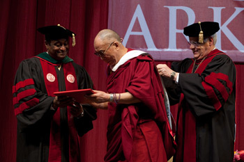 Chancellor Gearhart invited University of Arkansas board of trustees chairman Carl Johnson and University of Arkansas System President Alan Sugg to join him the presentation. Chancellor Gearhart remarked, “Honorary degrees are conferred on individuals who have achieved extraordinary distinctions in the sciences or the arts or public affairs. Recipients of the degrees are exceptional individuals who have demonstrated their appreciation of and dedication to the ideals and purposes of the University. It is my distinct pleasure and great honor to present H.H. the Dalai Lama for his promotion of basic human values, secular ethics in the interest of humanity, for fostering inter-religious harmony and welfare of the Tibetan people.”