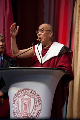 | His Holiness the Dalai Lama takes part in a panel discussion "Turning Swords into Ploughshares: The Many Paths of Non-Violence" at the University of Arkansas in Fayetteville, Arkansas on May 11, 2011. Photo/Russell Cothren |