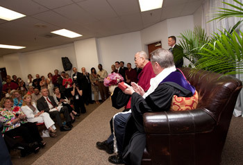 The Citation read. “University of Arkansas. To all to whom these presents may come. Greeting. Be it known that in recognition of his exalted character, his eminent attainments in arts and letters, his devotion to truth, duty and the welfare of society, the Board of Trustees of the University of Arkansas have this day conferred upon Tenzin Gyatso, His Holiness the Fourteenth Dalai Lama the degree of Doctor of Humane Letters with all the rights and privileges pertaining thereto. Fayetteville, Arkansas, May 14, 2011.”