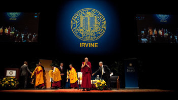 His Holiness then gave a public talk in the University’s Bren Events Center on Compassion and Global Leaders. His Holiness was introduced by Chancellor Drake who welcomed him back after his 2004 visit. The Chancellor also said that the Dalai Lama Scholarship was being made international.