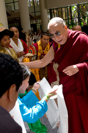 | His Holiness the Dalai Lama is greeted in traditional Tibetan manner on his arrival in Long Beach, California, on May 2, 2011. Photo/Don Farber |