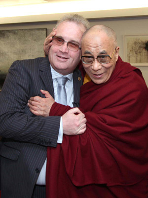 | His Holiness the Dalai Lama is met by Richard Moore on his arrival at Dublin airport on April 12th, 2011. Photo/Speirs |