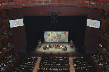 In the afternoon His Holiness returned to the New Jersey Performing Arts Center, venue of the conference, for the afternoon session. The theme was “Peace in the Community” and His Holiness’ co-panelists were Nobel Laureates Shirin Ebadi and Jody Williams; human rights pioneer Van Jones; Earl "The Street Doctor" Best, who supports the homeless; businesswoman Kirsten Giardi; actor Edward Norton; peace-building strategist Aldo Civico; Gay & Lesbian activist Daryl Presgraves; and Youth Representative, 11-year old Aaliyah Beckford.