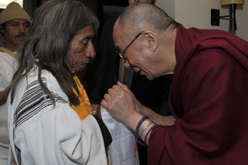 His Holiness holding hands with a participant from Columbia at the Newark Peace Education Summit in Newark, New Jersey, on May 14, 2011. Photo/Sonam Zoksang