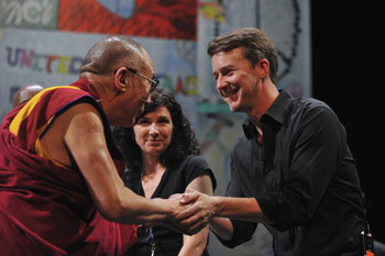 His Holiness the Dalai Lama greeting Ed Norton at the Newark Peace Education Summit in Newark, New Jersey, on May 14, 2011. Photo/Sonam Zoksang