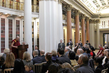 Dundee, Scotland, 22 June 2012 - “Good morning, I feel very fresh today, last night I had enough sleep, a good nine hours! And today my blood pressure is good, which must be a blessing of being in Scotland. So I’m happy to be here on my fifth visit,” was how His Holiness opened his remarks before a meeting of Members of the Scottish Parliament Cross Party Group on Tibet and members of the Tibetan community in Scotland in the Signet Library.