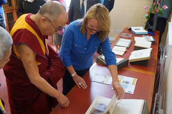 His Holiness the Dalai Lama is shown items related to Tibet during his visit to the National Library of Scotland in Edinburgh, Scotland, on June 22, 2012. Photo/Jeremy Russell/OHHDL