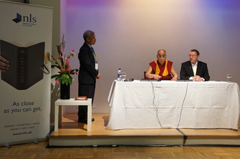 His Holiness the Dalai Lama meets with members of the press at the National Library of Scotland in Edinburgh, Scotland, on June 22, 2012. Photo/Jeremy Russell/OHHDL