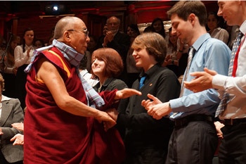 His Holiness the Dalai Lama greeting members of the audience after his talk "Beyond Religion: Ethics for a Whole World" at Usher Hall in Edinburgh, Scotland, on June 22, 2012. Photo/Jeremy Russell/OHHDL