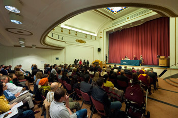 His Holiness the Dalai Lama delivering the CR Parekh Lecture on the Values of Democracy and Tibet at the University of Westminster in London, England, on June 19, 2012.