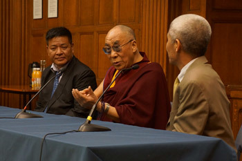 Speaker of the Tibetan Parliament in Exile Penpa Tsering (L) and His Holiness the Dalai Lama speaking to representatives of NGOs and Tibet Support Groups at the University of Westminster in London, England, on June 19, 2012. Photo/Jeremy Russell/OHHDL