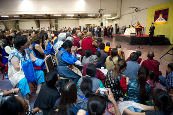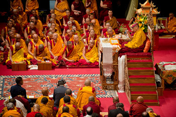 Milan, Italy, 28 June 2012 - His Holiness left his hotel early to have time to undertake the preparatory rituals for the Avalokiteshvara empowerment he was giving this morning. By the time he was ready most people had taken their seats in the stadium that was filled to its 10,000 capacity.