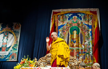 | His Holiness the Dalai Lama greeting the audience before his public talk in Milan, Italy, on June 28, 2012. Photo/Tenzin Choejor/OHHDL |
